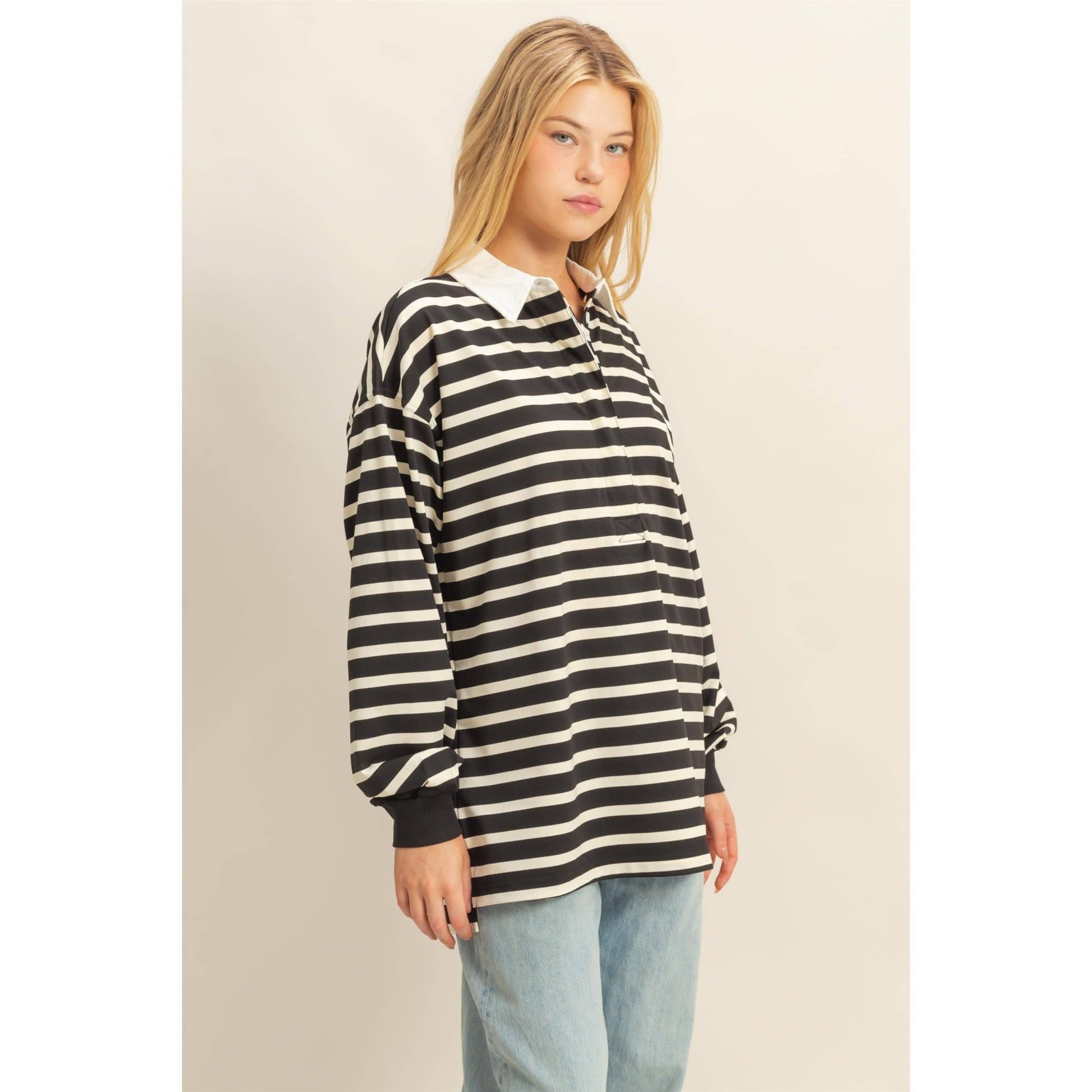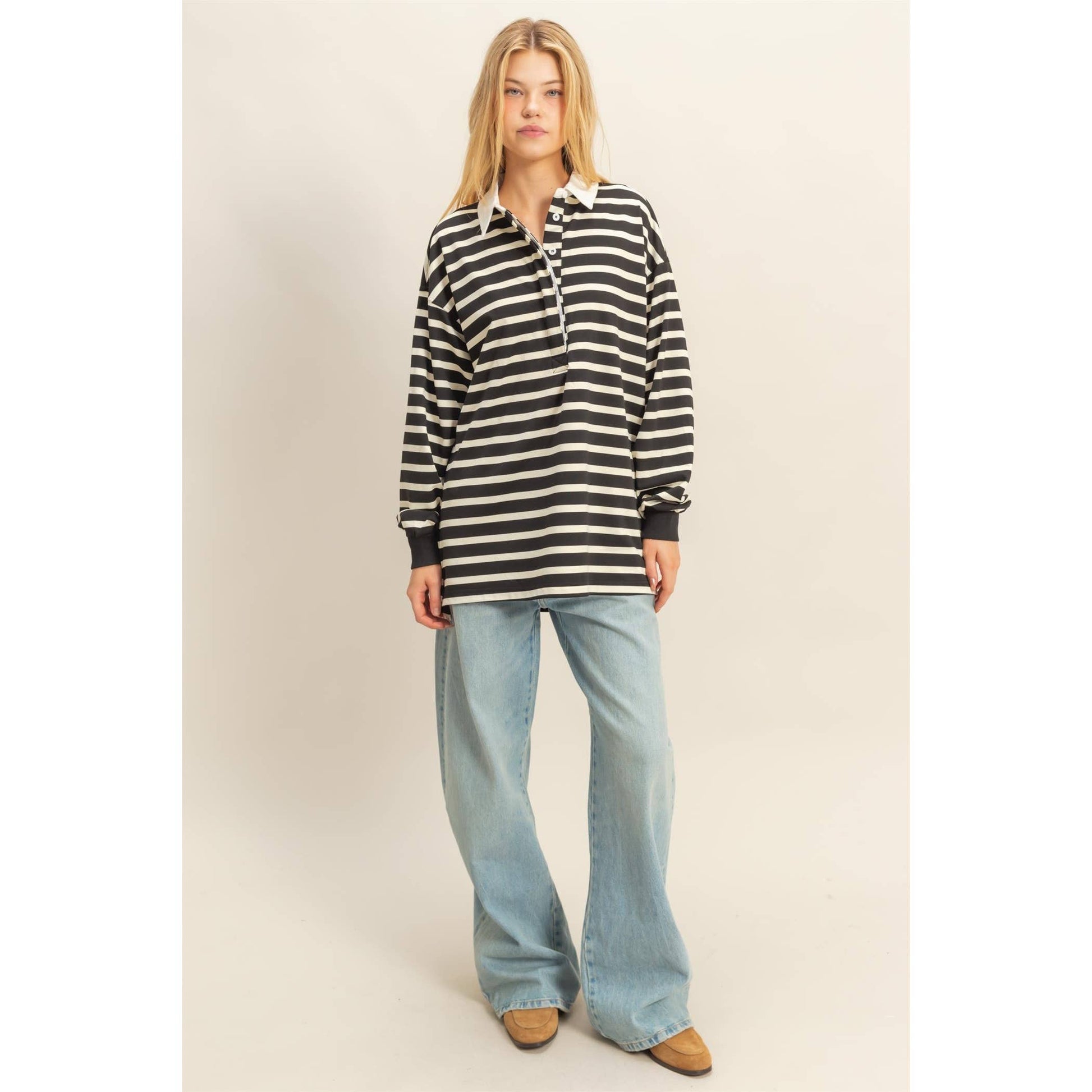 A classic striped rugby polo with a crisp collar and relaxed fit that gives effortless cool, slightly preppy energy without feeling try-hard.